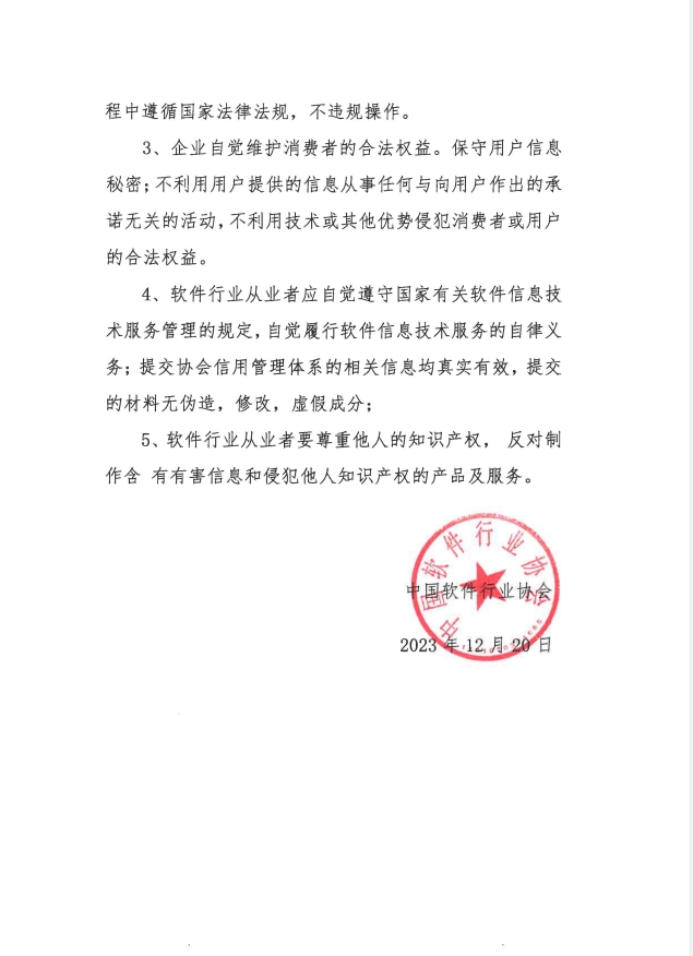 根據(jù)評選要求,企業(yè)須連續(xù)三年參加中國軟件行業(yè)協(xié)會開展的軟件企業(yè)信用評價(jià)工作并獲得AAA級別,方可獲得中國軟件誠信示范企業(yè)評選資格。公司一直以來嚴(yán)格遵守《中國軟件行業(yè)自律公約》依法經(jīng)營、誠實(shí)守信,自2014年起,連續(xù)多次參加中國軟件行業(yè)協(xié)會開展的軟件企業(yè)信用評價(jià)工作,并獲得AAA信用評級,完全符合中國軟件誠信示范企業(yè)評選要求。
